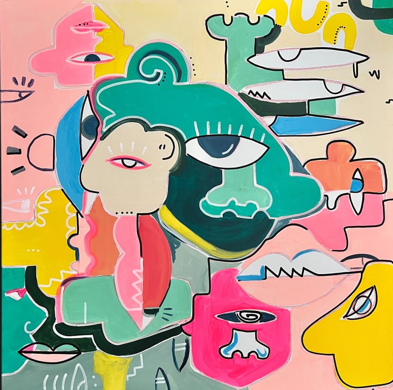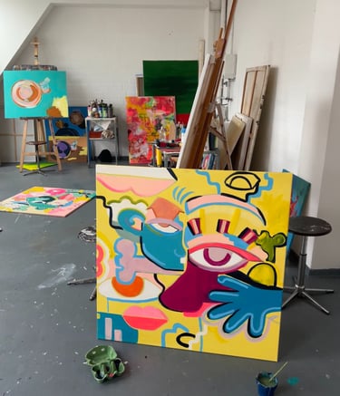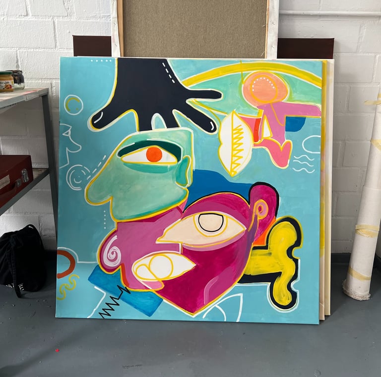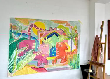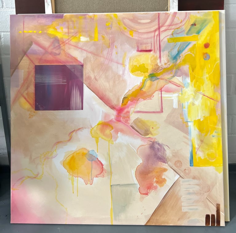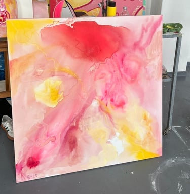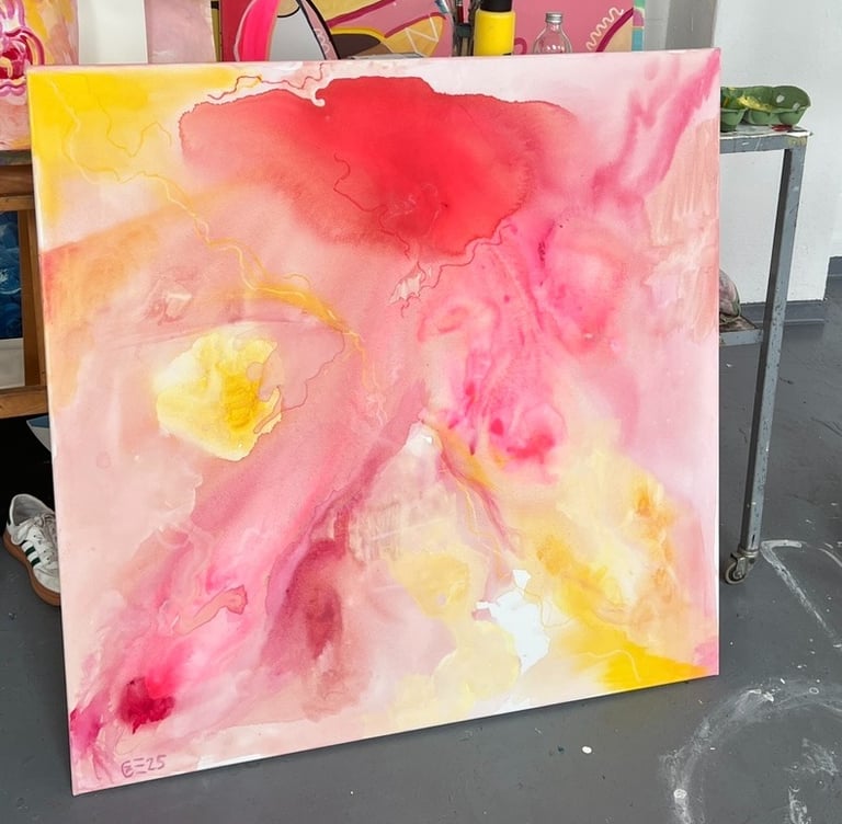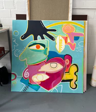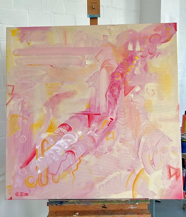 This painting is inspired by my travels on Mallorca. It shows people swimming in a dreamy swimming pool.