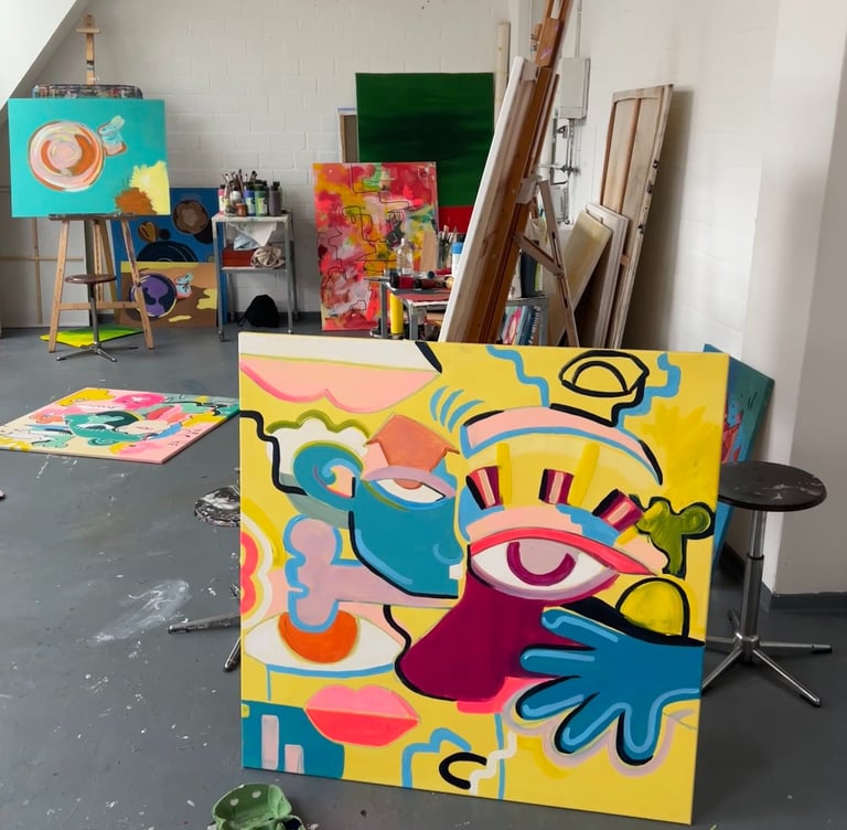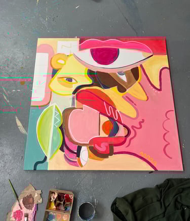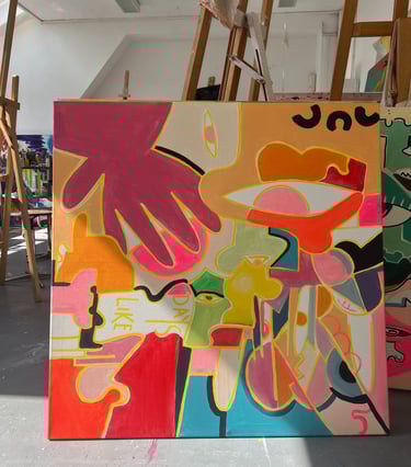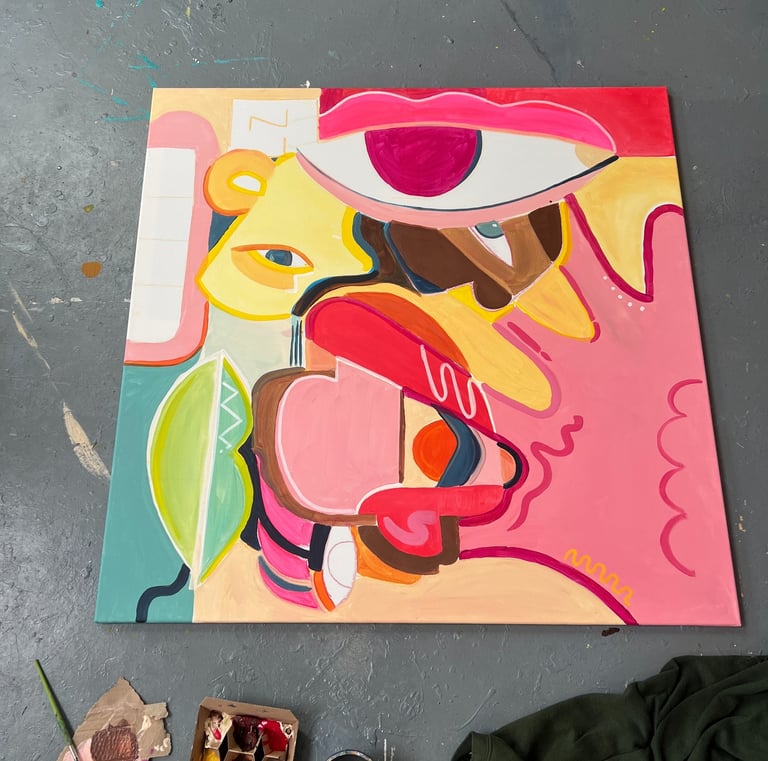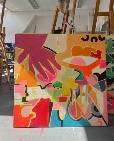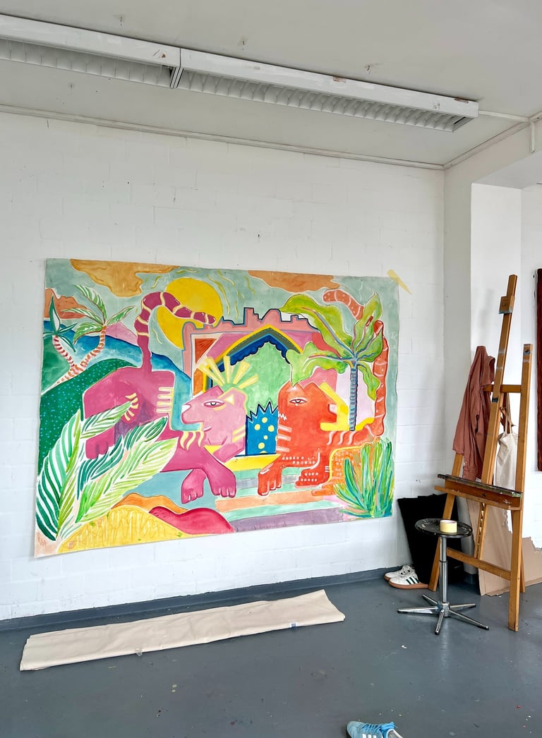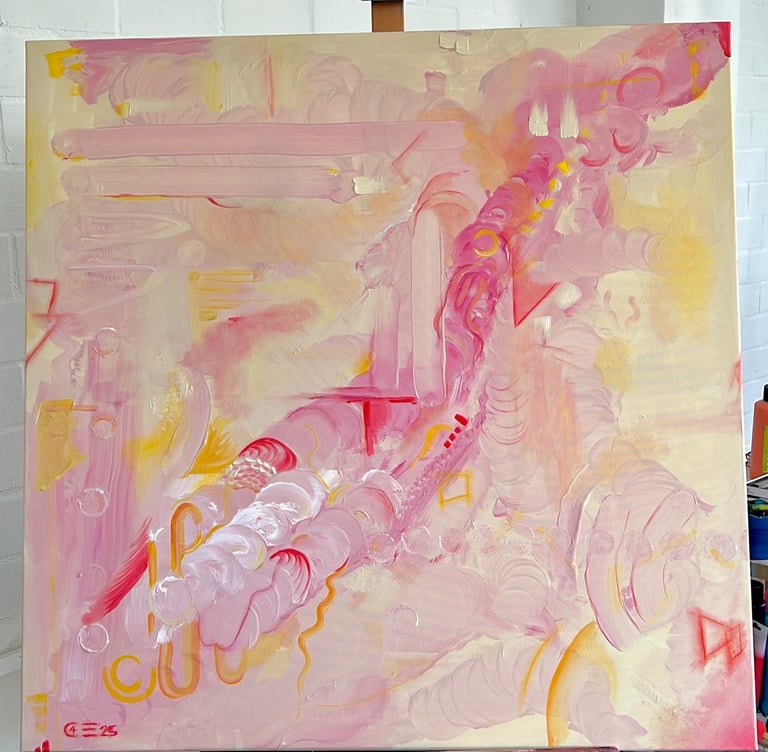 This painting is inspired by my travels on Mallorca. It shows people swimming in a dreamy swimming pool.