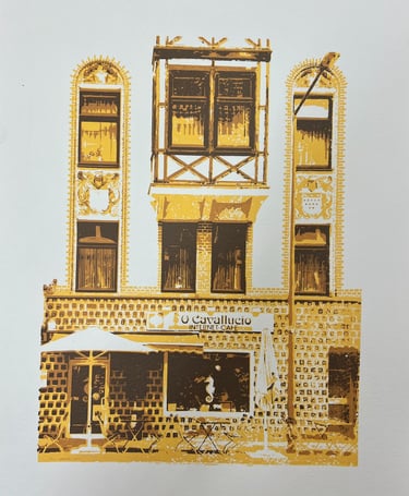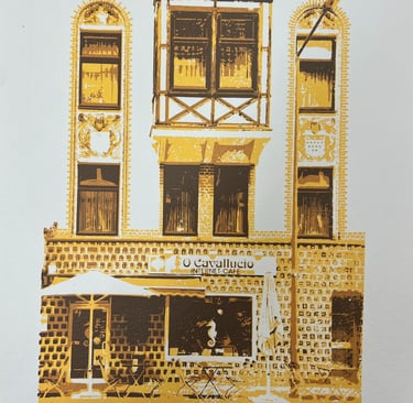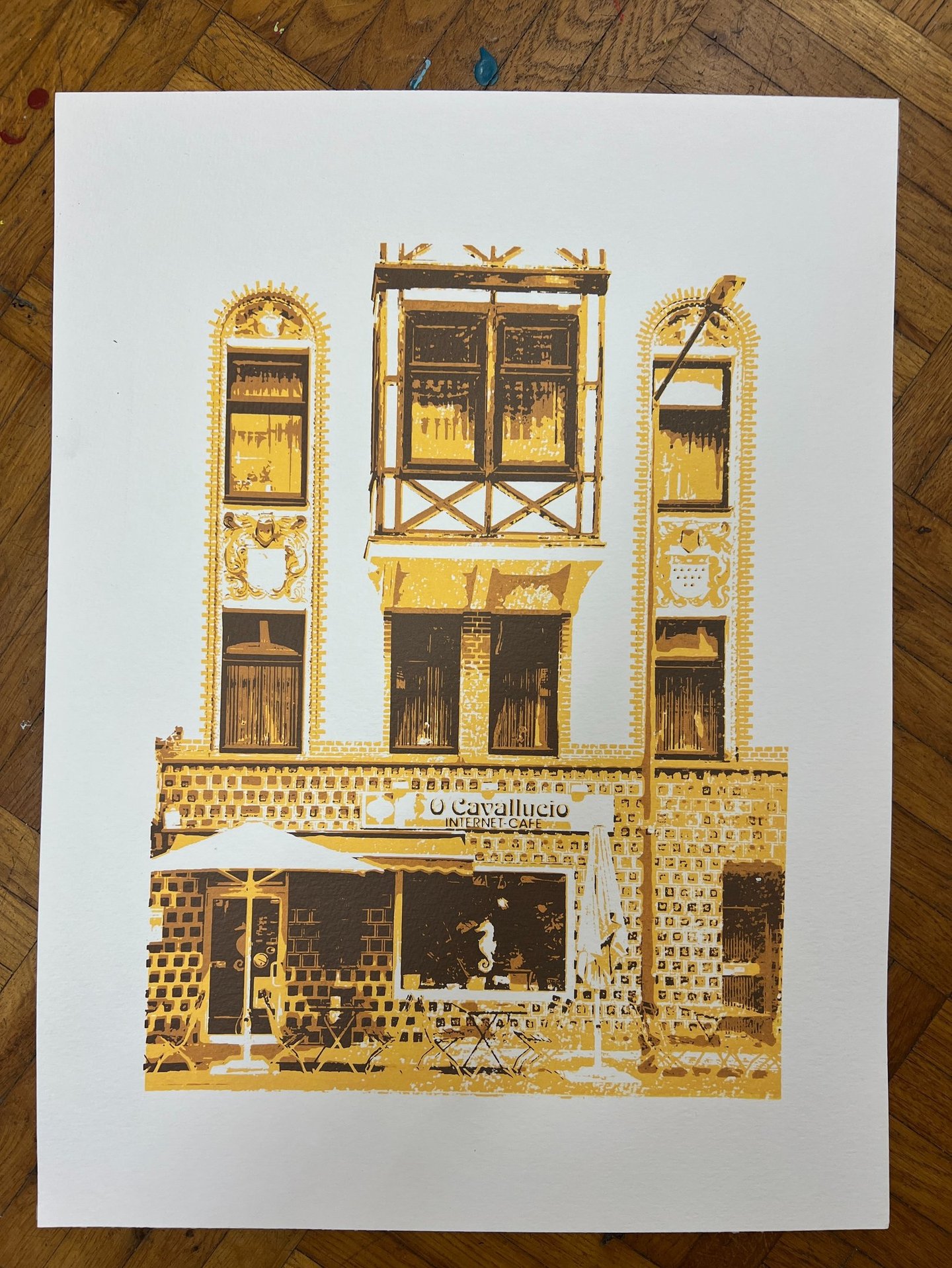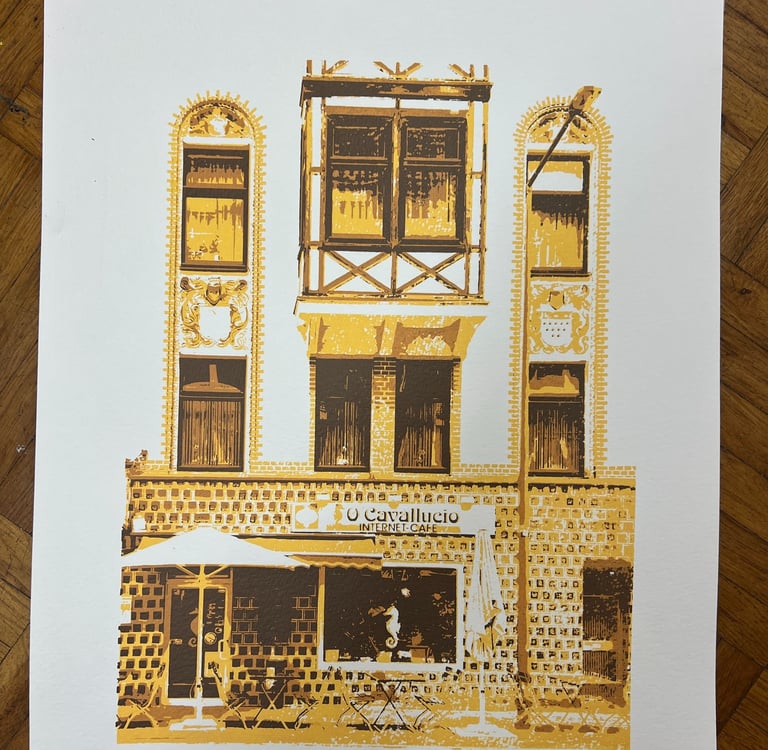 This was my first screen print which took more than 35 hours to make showing a bar scene in cologne, germany. Created in 3 layers.